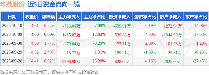 证券之星消息,截至2025年10月10日收盘,华茂股份(000850)报收于4.61元,上涨0.22%,换手率2.08%,成交量19.63万手,成交额9051.94万元。