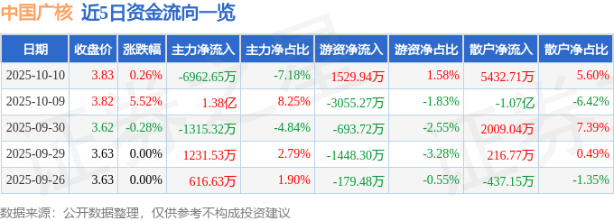 证券之星消息,截至2025年10月10日收盘,中国广核(003816)报收于3.83元,上涨0.26%,换手率0.64%,成交量253.61万手,成交额9.7亿元。
