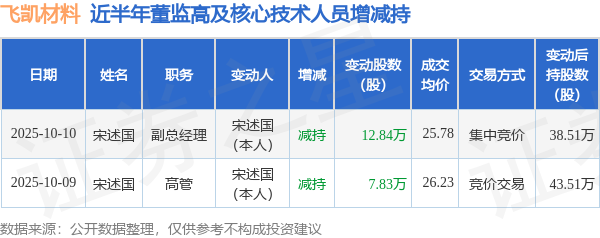 飞凯材料近半年内的董监高及核心技术人员增减持详情如下: