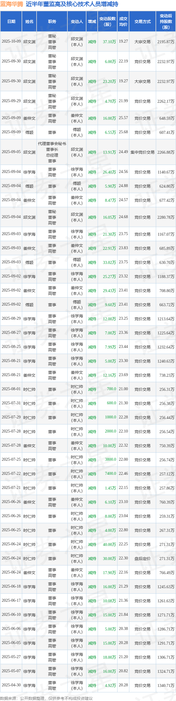 蓝海华腾近半年内的董监高及核心技术人员增减持详情如下: