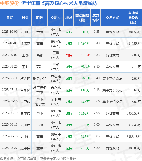 中亚股份近半年内的董监高及核心技术人员增减持详情如下: