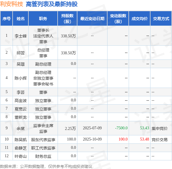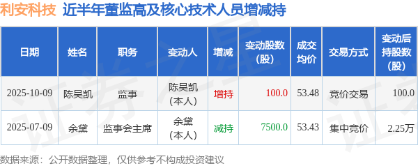 利安科技近半年内的董监高及核心技术人员增减持详情如下: