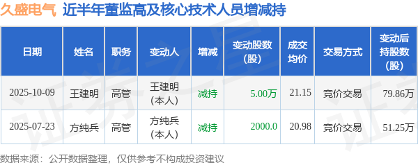 久盛电气近半年内的董监高及核心技术人员增减持详情如下: