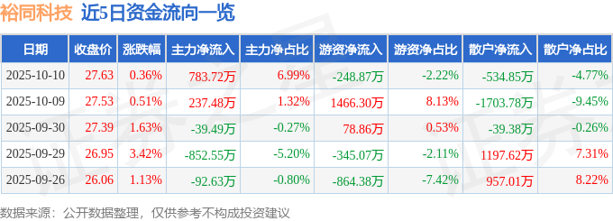 证券之星消息,截至2025年10月10日收盘,裕同科技(002831)报收于27.63元,上涨0.36%,换手率0.8%,成交量4.1万手,成交额1.12亿元。