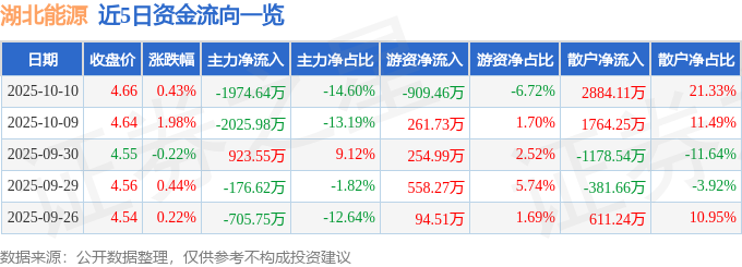 证券之星消息,截至2025年10月10日收盘,湖北能源(000883)报收于4.66元,上涨0.43%,换手率0.45%,成交量29.08万手,成交额1.35亿元。