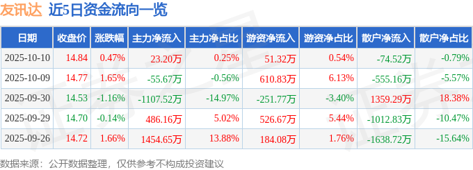 10月10日的资金流向数据方面,主力资金净流入23.2万元,占总成交额0.25%,游资资金净流入51.32万元,占总成交额0.54%,散户资金净流出74.52万元,占总成交额0.79%。