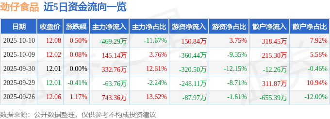 证券之星消息,截至2025年10月10日收盘,劲仔食品(003000)报收于12.08元,上涨0.5%,换手率1.11%,成交量3.33万手,成交额4019.71万元。