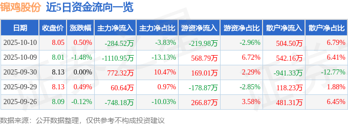 证券之星消息,截至2025年10月10日收盘,锦鸡股份(300798)报收于8.05元,上涨0.5%,换手率2.47%,成交量9.21万手,成交额7430.44万元。