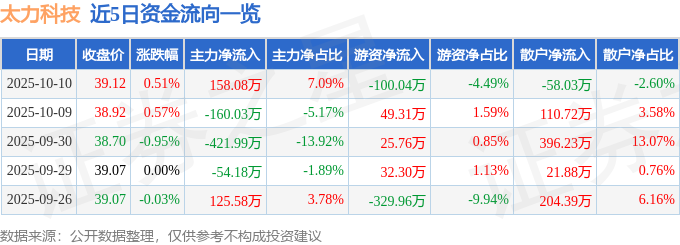 证券之星消息,截至2025年10月10日收盘,太力科技(301595)报收于39.12元,上涨0.51%,换手率2.47%,成交量5706.0手,成交额2229.69万元。