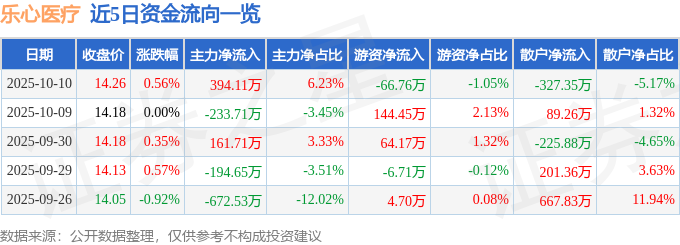 证券之星消息,截至2025年10月10日收盘,乐心医疗(300562)报收于14.26元,上涨0.56%,换手率2.73%,成交量4.43万手,成交额6329.88万元。