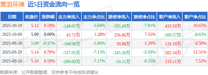 证券之星消息,截至2025年10月10日收盘,雪浪环境(300385)报收于5.12元,上涨0.59%,换手率2.71%,成交量7.88万手,成交额4071.13万元。