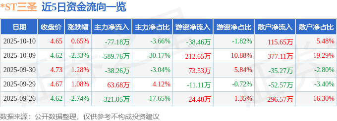 证券之星消息,截至2025年10月10日收盘,*ST三圣(002742)报收于4.65元,上涨0.65%,换手率1.05%,成交量4.52万手,成交额2109.43万元。