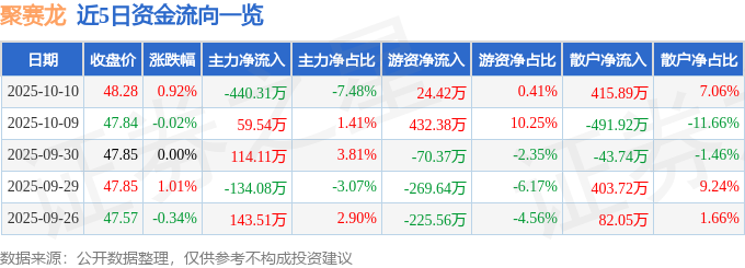 证券之星消息,截至2025年10月10日收盘,聚赛龙(301131)报收于48.28元,上涨0.92%,换手率3.96%,成交量1.22万手,成交额5886.71万元。