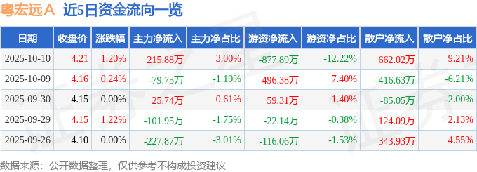 证券之星消息,截至2025年10月10日收盘,粤宏远A(000573)报收于4.21元,上涨1.2%,换手率2.7%,成交量17.09万手,成交额7184.64万元。