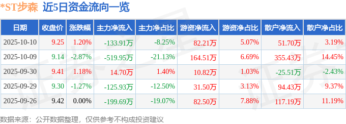 证券之星消息,截至2025年10月10日收盘,*ST步森(002569)报收于9.25元,上涨1.2%,换手率1.25%,成交量1.76万手,成交额1622.85万元。