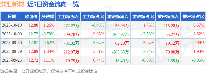 10月10日的资金流向数据方面,主力资金净流出272.22万元,占总成交额8.43%,游资资金净流入56.93万元,占总成交额1.76%,散户资金净流入215.28万元,占总成交额6.67%。