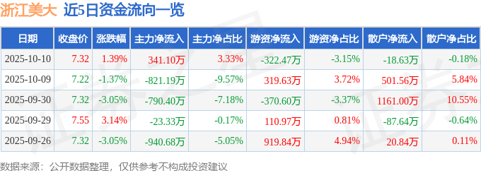 证券之星消息,截至2025年10月10日收盘,浙江美大(002677)报收于7.32元,上涨1.39%,换手率2.61%,成交量13.94万手,成交额1.02亿元。