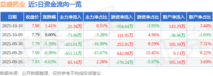 证券之星消息,截至2025年10月10日收盘,益盛药业(002566)报收于7.9元,上涨1.41%,换手率2.27%,成交量5.27万手,成交额4165.91万元。