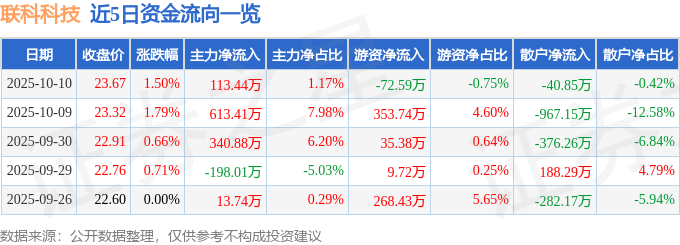 10月10日的资金流向数据方面,主力资金净流入113.44万元,占总成交额1.17%,游资资金净流出72.59万元,占总成交额0.75%,散户资金净流出40.85万元,占总成交额0.42%。
