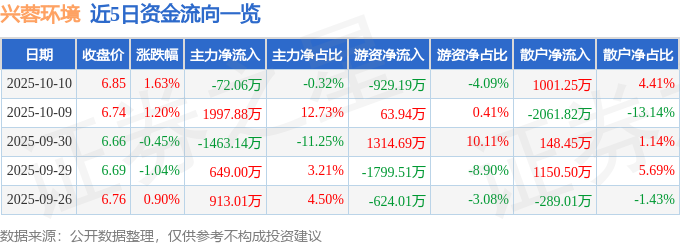 证券之星消息,截至2025年10月10日收盘,兴蓉环境(000598)报收于6.85元,上涨1.63%,换手率1.12%,成交量33.29万手,成交额2.27亿元。