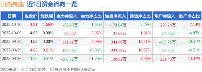 证券之星消息,截至2025年10月10日收盘,山西高速(000755)报收于4.91元,上涨1.66%,换手率0.44%,成交量6.5万手,成交额3167.82万元。