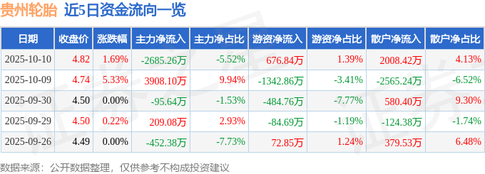 证券之星消息,截至2025年10月10日收盘,贵州轮胎(000589)报收于4.82元,上涨1.69%,换手率6.63%,成交量101.91万手,成交额4.87亿元。