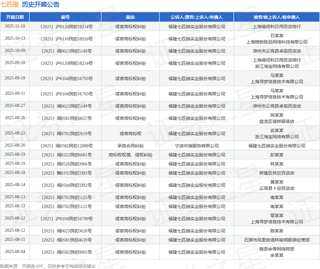 案号:(2025)沪0110民初18920号根据统计,近一年内以福建七匹狼实业股份有限公司为当事人的历史开庭公告有178则,其中案由为“侵害商标权纠纷”的公告以158则居首,其次为“不正当竞争纠纷”有10则,“承揽合同纠纷”有4则。历史开庭公告(前20条)如下: