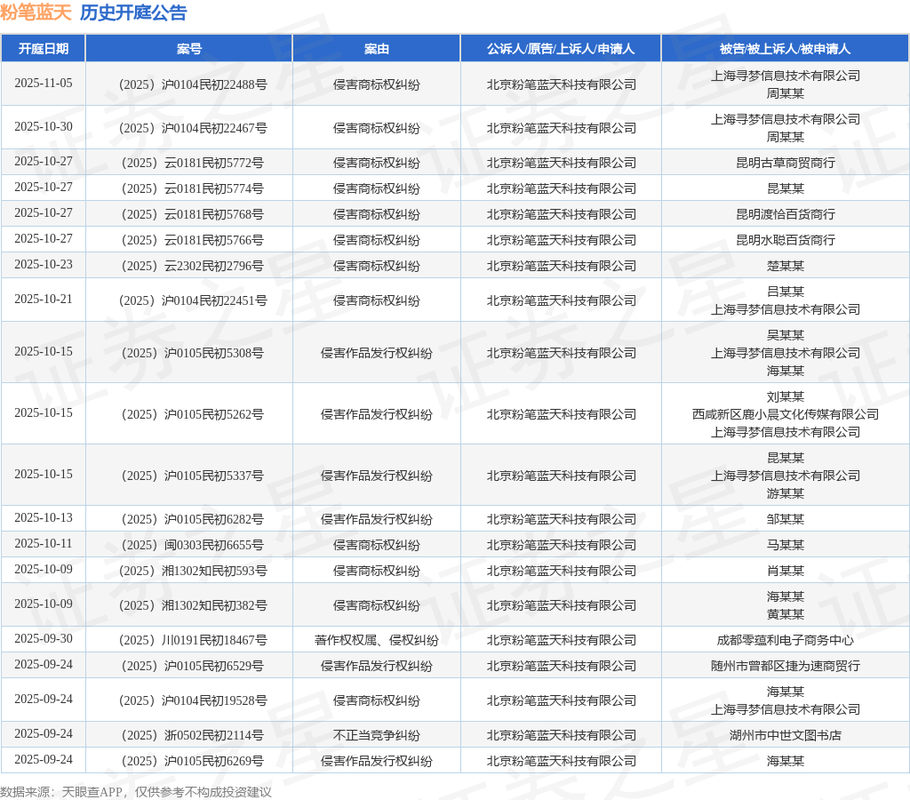案号:(2025)沪0105民初6282号根据统计,近一年内以北京粉笔蓝天科技有限公司为当事人的历史开庭公告有375则,其中案由为“侵害作品发行权纠纷”的公告以242则居首,其次为“侵害商标权纠纷”有108则,“著作权权属、侵权纠纷”有9则。历史开庭公告(前20条)如下: