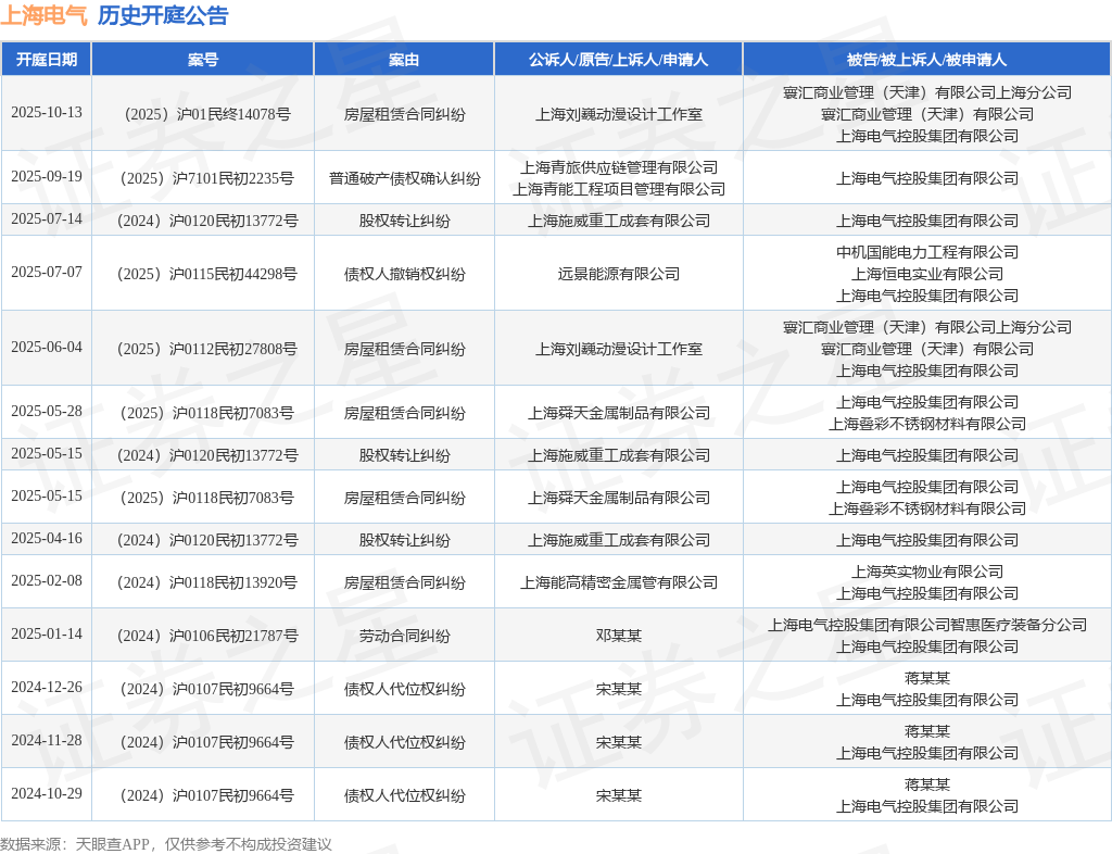 案号:(2025)沪01民终14078号根据统计,近一年内以上海电气控股集团有限公司为当事人的历史开庭公告有14则,其中案由为“房屋租赁合同纠纷”的公告以5则居首,其次为“债权人代位权纠纷”有3则,“股权转让纠纷”有3则。历史开庭公告如下: