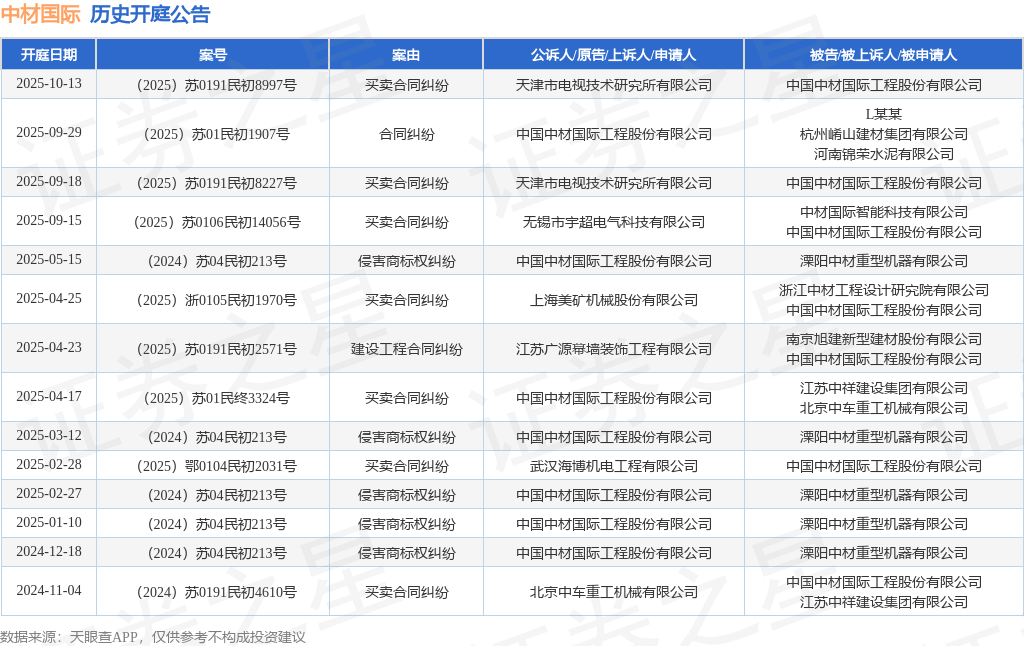 案号:(2025)苏0191民初8997号根据统计,近一年内以中国中材国际工程股份有限公司为当事人的历史开庭公告有14则,其中案由为“买卖合同纠纷”的公告以7则居首,其次为“侵害商标权纠纷”有5则,“合同纠纷”有1则。历史开庭公告如下: