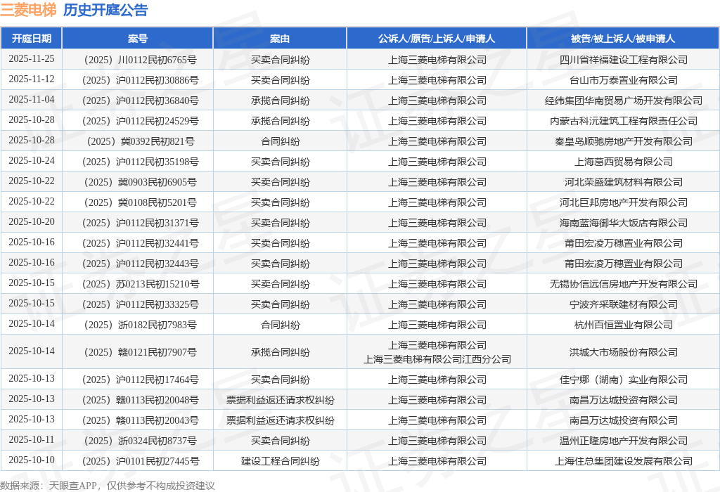 案号:(2025)沪0112民初17464号根据统计,近一年内以上海三菱电梯有限公司为当事人的历史开庭公告有481则,其中案由为“买卖合同纠纷”的公告以312则居首,其次为“承揽合同纠纷”有73则,“票据纠纷”有17则。历史开庭公告(前20条)如下: