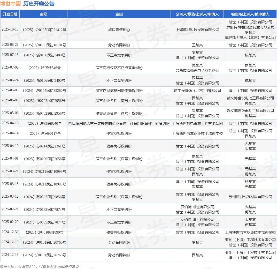 案号:(2025)沪0105民初21412号根据统计,近一年内以博世(中国)投资有限公司为当事人的历史开庭公告有23则,其中案由为“侵害商标权纠纷”的公告以6则居首,其次为“侵害企业名称(商号)权纠纷”有5则,“不正当竞争纠纷”有4则。历史开庭公告(前20条)如下: