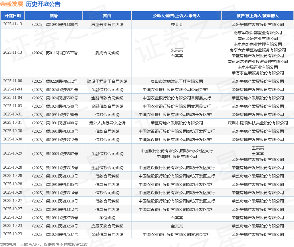 案号:(2025)冀1091民初3059号根据统计,近一年内以荣盛房地产发展股份有限公司为当事人的历史开庭公告有440则,其中案由为“借款合同纠纷”的公告以84则居首,其次为“票据追索权纠纷”有83则,“房屋买卖合同纠纷”有72则。历史开庭公告(前20条)如下: