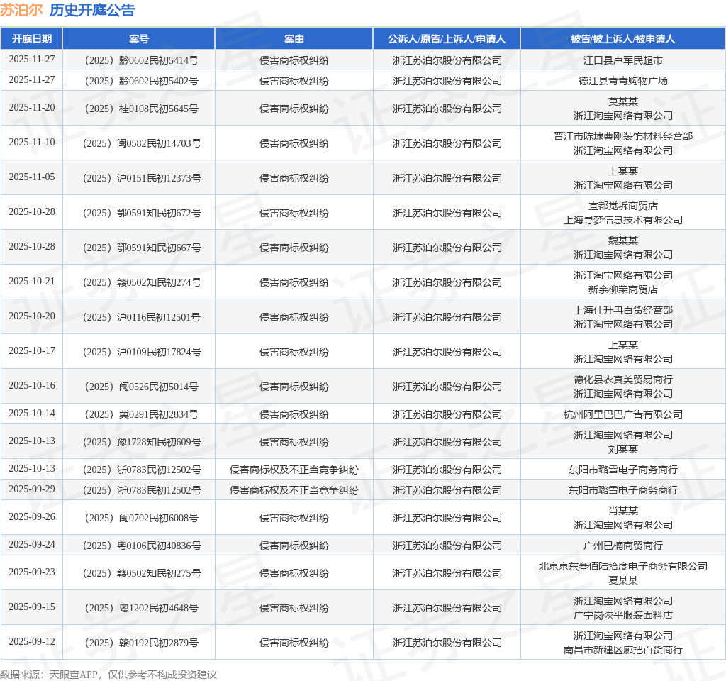 案号:(2025)浙0783民初12502号根据统计,近一年内以浙江苏泊尔股份有限公司为当事人的历史开庭公告有161则,其中案由为“侵害商标权纠纷”的公告以121则居首,其次为“商标权权属、侵权纠纷”有16则,“侵害商标权”有5则。历史开庭公告(前20条)如下: