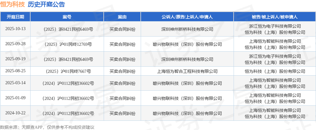 根据统计,近一年内以恒为科技(上海)股份有限公司为当事人的历史开庭公告有7则,其中案由为“买卖合同纠纷”的公告以7则居首。历史开庭公告如下: