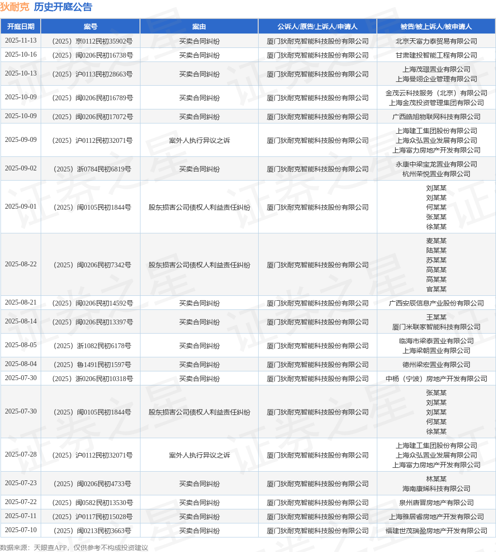 案号:(2025)沪0113民初28663号根据统计,近一年内以厦门狄耐克智能科技股份有限公司为当事人的历史开庭公告有108则,其中案由为“买卖合同纠纷”的公告以73则居首,其次为“合同纠纷”有27则,“股东损害公司债权人利益责任纠纷”有3则。历史开庭公告(前20条)如下:
