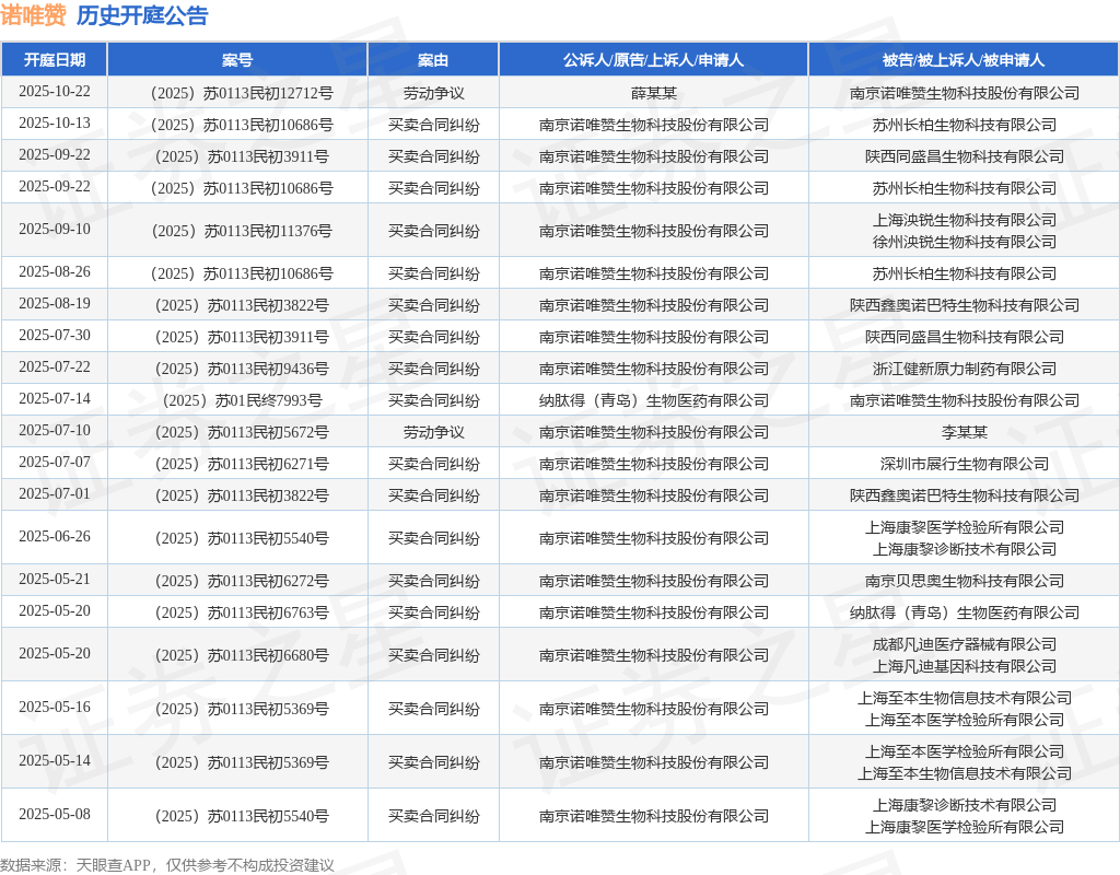 案号:(2025)苏0113民初10686号根据统计,近一年内以南京诺唯赞生物科技股份有限公司为当事人的历史开庭公告有31则,其中案由为“买卖合同纠纷”的公告以26则居首,其次为“劳动争议”有4则,“房屋租赁合同纠纷”有1则。历史开庭公告(前20条)如下: