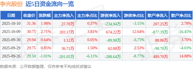 10月10日的资金流向数据方面,主力资金净流入27.7万元,占总成交额0.37%,游资资金净流出234.94万元,占总成交额3.15%,散户资金净流入207.25万元,占总成交额2.78%。