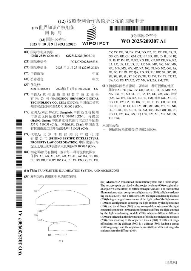 证券之星消息,根据企查查数据显示海康威视(002415)公布了一项国际专利申请,专利名为“透射照明系统和显微镜”,专利申请号为PCT/CN2025/085321,国际公布日为2025年10月9日。