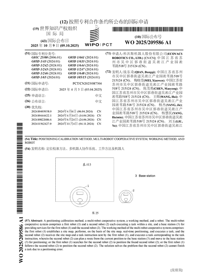 证券之星消息,根据企查查数据显示科沃斯(603486)公布了一项国际专利申请,专利名为“定位校准方法、多机器人协作系统、工作方法及机器人”,专利申请号为PCT/CN2025/087304,国际公布日为2025年10月9日。
