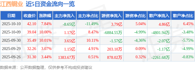 证券之星消息,截至2025年10月10日收盘,江西铜业(600362)报收于42.1元,上涨7.84%,换手率8.7%,成交量180.45万手,成交额75.26亿元。