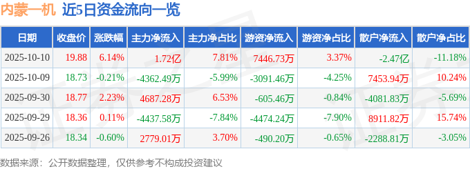 证券之星消息,截至2025年10月10日收盘,内蒙一机(600967)报收于19.88元,上涨6.14%,换手率6.63%,成交量112.79万手,成交额22.08亿元。