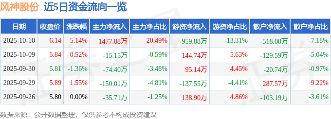 证券之星消息,截至2025年10月10日收盘,风神股份(600469)报收于6.14元,上涨5.14%,换手率1.64%,成交量11.96万手,成交额7212.55万元。