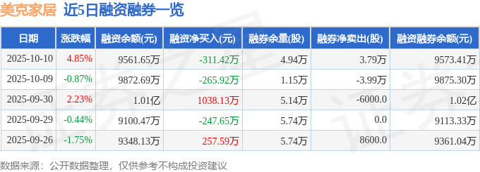 美克家居融资融券信息显示,融资方面,当日融资买入1865.46万元,融资偿还2176.88万元,融资净偿还311.42万元。融券方面,融券卖出3.79万股,融券偿还0.0股,融券余量4.94万股,融券余额11.76万元。融资融券余额9573.41万元。