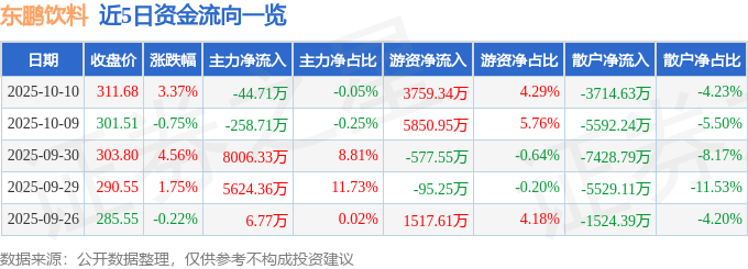证券之星消息,截至2025年10月10日收盘,东鹏饮料(605499)报收于311.68元,上涨3.37%,换手率0.55%,成交量2.84万手,成交额8.77亿元。