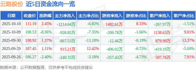 证券之星消息,截至2025年10月10日收盘,云路股份(688190)报收于111.19元,上涨2.45%,换手率1.32%,成交量1.58万手,成交额1.78亿元。
