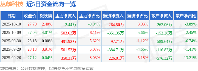 证券之星消息,截至2025年10月10日收盘,丛麟科技(688370)报收于27.7元,上涨2.4%,换手率5.69%,成交量2.49万手,成交额6737.39万元。