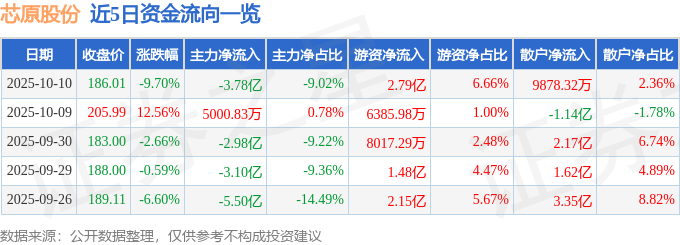 10月10日的资金流向数据方面,主力资金净流出3.78亿元,占总成交额9.02%,游资资金净流入2.79亿元,占总成交额6.66%,散户资金净流入9878.32万元,占总成交额2.36%。