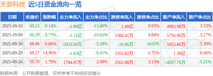证券之星消息,截至2025年10月10日收盘,天奈科技(688116)报收于60.23元,下跌9.14%,换手率6.58%,成交量22.69万手,成交额14.13亿元。