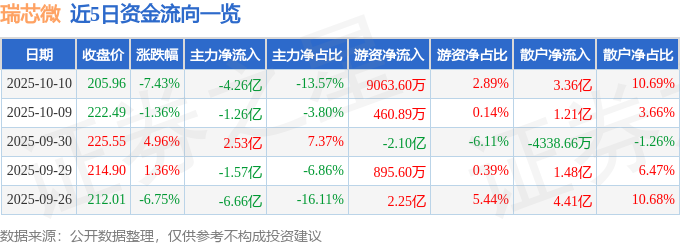 证券之星消息,截至2025年10月10日收盘,瑞芯微(603893)报收于205.96元,下跌7.43%,换手率3.53%,成交量14.85万手,成交额31.4亿元。